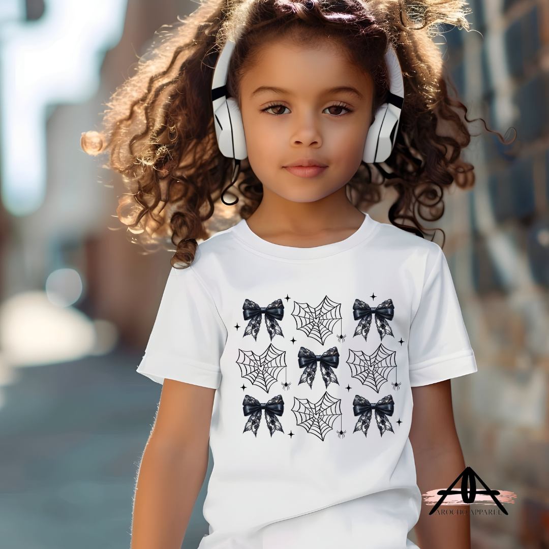 This Halloween, dress your toddler in our adorable Croquette Bow tee made from a comfortable poly blend. Let them stand out in style and feel the spooky spirit with this unique Halloween themed shirt. Perfect for any little fashionista!